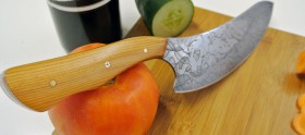 This particular knife has an extremely rare handle material. The beautiful English Yew Wood on the handle was cut in Sherwood Forest, England. This wood is highly sought after and still considered some of the best wood in the world for making long bows. Due to over-forestation over the years, Sherwood Forest is protected by law against unauthorized removal of any trees, even if they are already felled or dead. As a result of this, it is extremely difficult to actually get a hold of any of this wood and I only have a very small amount. Once it’s gone, it will be unlikely that I’ll be able to get more. Aside from being an excellent hard wood, the Yew wood is stunningly beautiful. It has a light tan, almost yellowish base with dark orange grain that runs relatively straight and even down the whole handle. Aged neatsfoot oil brought out the shine and then it was sealed for water resistance. As with any good kitchen knife, this should never go in the dishwasher and only be hand washed.