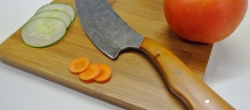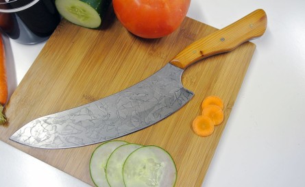 The Roll-E-Chopper takes the wide-blade chefs knife of the Phoenix Chef and dramatically arcs the edge upward. This allows for a great amount of speed and control for dicing and mincing. The slightly raised handle not only gives the knife an Ulu-like design and feel…but also allows for a full rocking motion of the blade before the handle hits the cutting board! With a balance point just in front of the handle scales, this knife has an excellent feel and precision control. If you’re looking a good chefs knife and love to cook in a style using a rocking motion….the Roll-E-Chopper is for you!